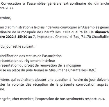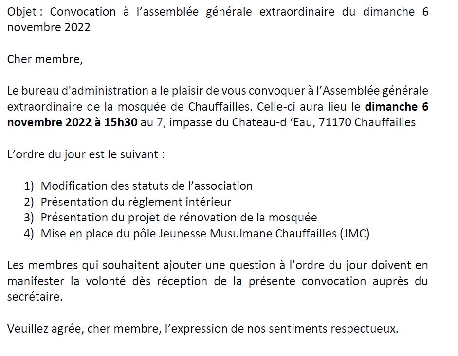 Le bureau d’administration a le plaisir de vous convoquer à l’Assemblée générale extraordinaire de la mosquée de Chauffailles. Celle-ci aura lieu le dimanche 6 novembre 2022 à 15h30 au 7, impasse du Chateau-d ‘Eau, 71170 Chauffailles